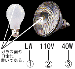 | 1)ランプの種類 LW--シリカ電球 L --クリア電球 GW--ボール電球(シリカ) GC--ボール電球(クリア) RF --レフ電球(散光) RS--レフ電球(集光) CRF-ビームランプ LDS--ミニクリプトン電球 2)ランプの定格電圧(V) 3)ランプの定格電力(W) 注1 代表的な物です。 注2 これにあてはまらない物も有ります。 注3 型式の明記してない物も有ります。 |