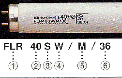 | 1)ランプの形状・タイプを示す FL グロースタータ形直管 FCL グロースタータ形丸形 FLR ラピッドスタート形直管 2)ランプの定格電力(W)形 3)ガラス管の太さ なし 又は H 38mm S 32.5mm SS 28mm 4)光源色及び演色性を示す 5)ラピッドスタータ形の始動補助の方法を示す A 管外面に撥水皮膜塗布 M 管内面に導電性透明皮膜塗布 6)省電力形のランプ定格電力 |